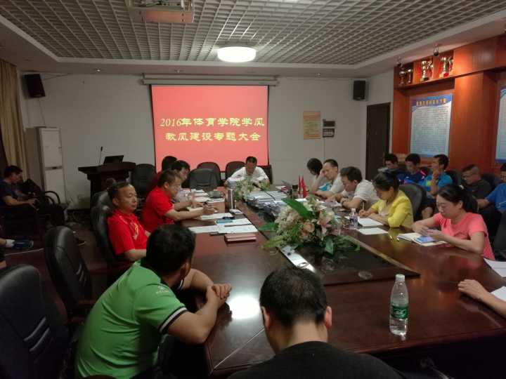 (通讯员 郭羽)2016年5月11日晚上,体育学院在院会议室召开了教风、学风建设专题研讨会,与会人员有学院班子成员、体育专业任课教师、班主任、辅导员、教务秘书共42人。会议由党总支副书记郭羽主持。