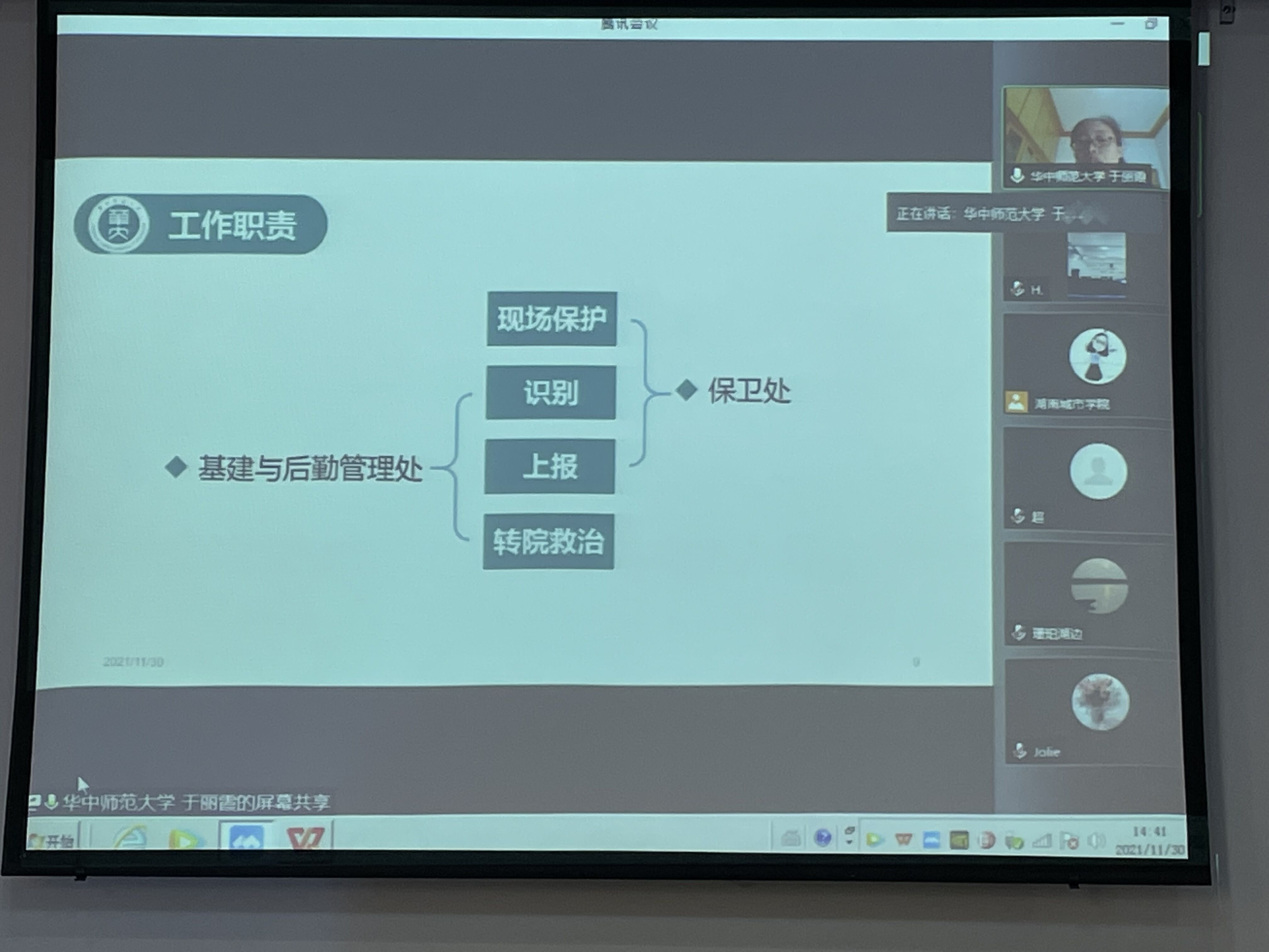基建与后勤管理处、保卫处人员每天与各类学生接触,在学生危机识别和干预中有着重要作用,是学生危机干预中的重要一环。本次讲座邀请华中师范大学大学生心理健康教育中心于丽霞博士作为主讲嘉宾,由于受到疫情影响,讲座采用腾讯会议远程在线形式进行。