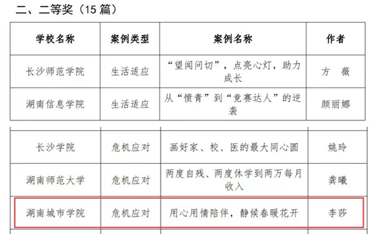 据悉,本次大赛由湖南省高校大学生心理健康教育研究会主办,旨在促进高校辅导员职业化、专业化发展,充分发挥高校辅导员在学生成长成才路上的引领作用,经专家评审,最终10篇案例获一等奖、15篇案例获二等奖、25篇案例获三等奖。