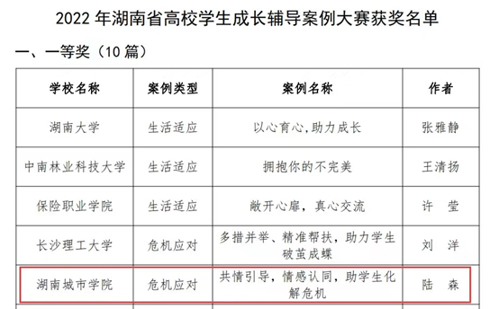 近日,2022年湖南省高校学生成长辅导案例大赛评选结果揭晓,我校市政与测绘工程学院辅导员陆森撰写的《共情引导,情感认同,助学生化解危机》喜获一等奖,人文学院辅导员李莎撰写的《用心用情陪伴,静候春暖花开》荣获二等奖。