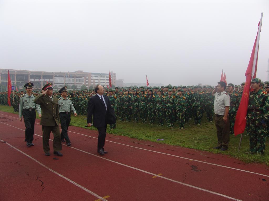 学校武装部肖部长和孟校长一同检阅各学院方队